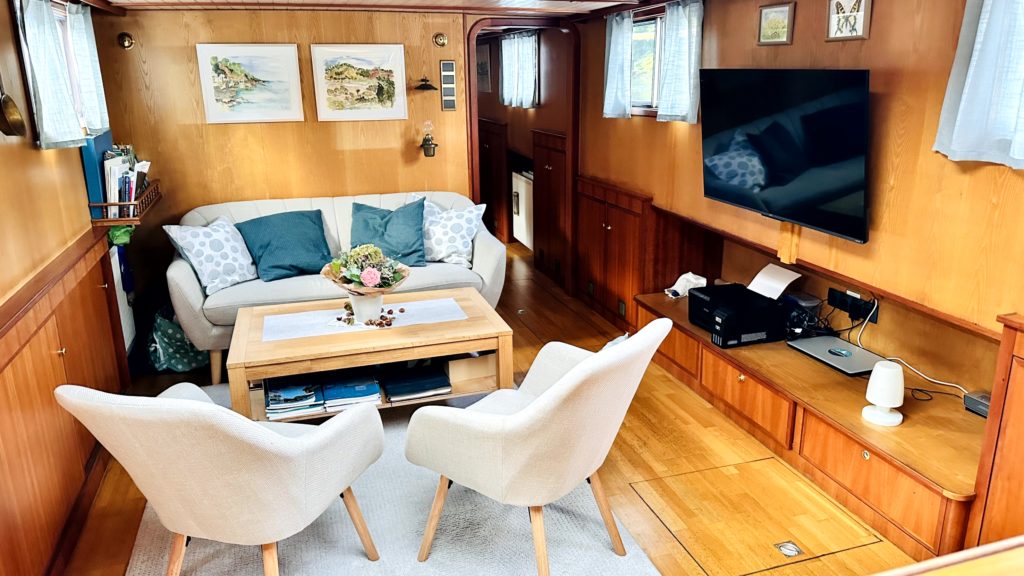Im geräumigen Steuerhaus sind rundum große Fenster. Somit hat man hinter dem Steuerrad einen ungehinderten Blick nach allen Seiten und kann den Ausblick aufs Wasser, ins Grüne, sowie auf die vorbeiziehenden Sehenswürdigkeiten genießen. Eine einladende Sitzgruppe für sechs Personen bietet hier einen geschützten Platz.